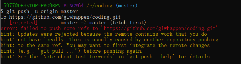 我在github库中对某个文件进行了在线的编辑,并且没有同步到本地库,之后我在本地库添加了文件test.txt,并想提交到github,出现以下错误:error:failed to push some refs to。